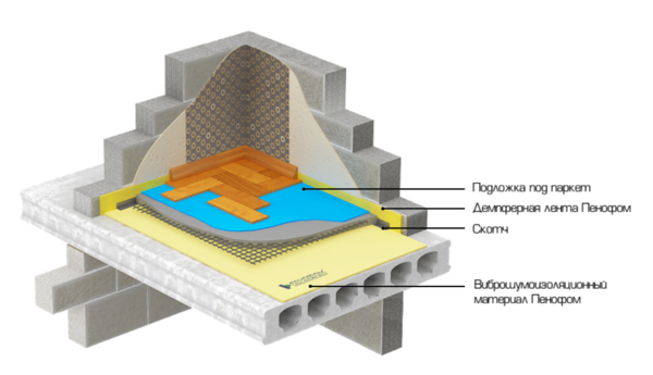 «Плавающий» пол представляет собой многослойную конструкцию, которая монтируется на монолитной либо пустотной плите перекрытия и изолируется от несущих конструкций упругой (вибродемпфирующей) прокладкой Пенофом.